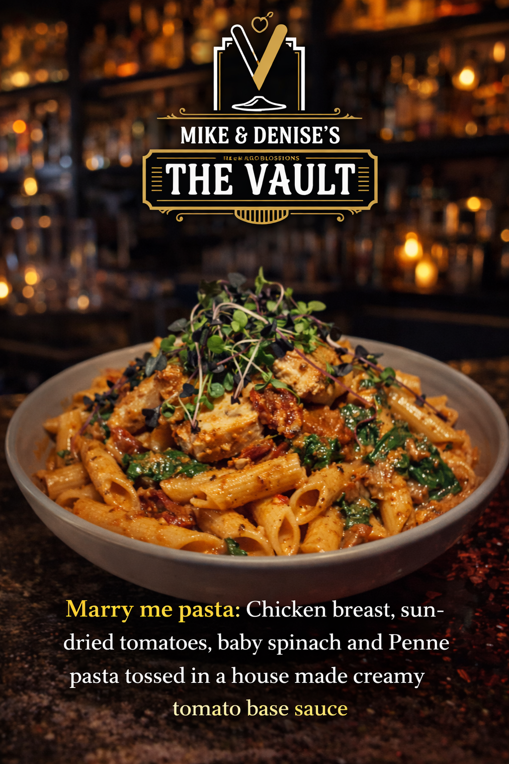 evoo / garlic / shallots / basil / heavy cream / vodka sauce with a hint of sundried tomatoes / parmesan / cavatappi